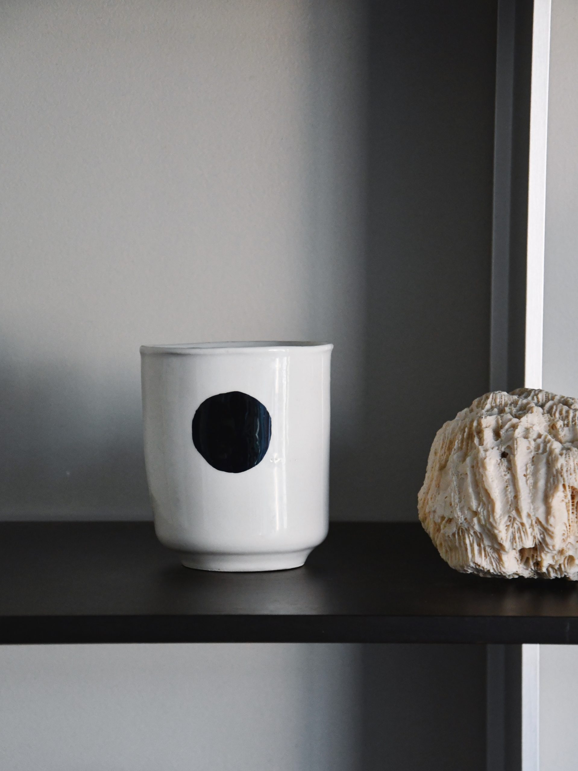 This ceramic cup features a bold painted dot and a slight thumb rest for a more natural and comfortable grip.