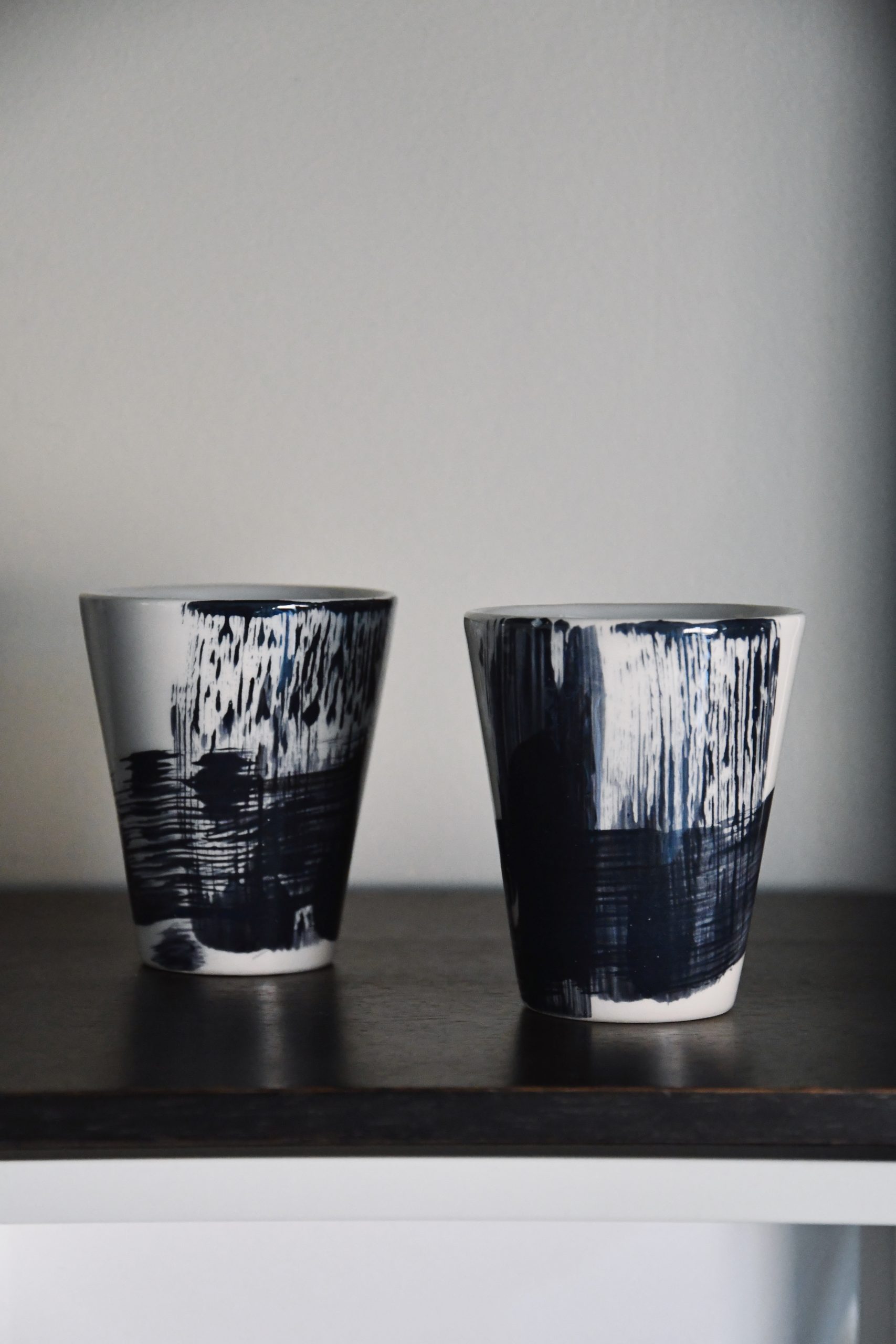 The V Cup is crafted from white clay and finished with expressive deep cobalt blue brushstrokes. Its subtle V-shaped silhouette gives the piece a clean, contemporary presence, while the glossy glaze amplifies the movement of the pigment with a luminous finish. Bold yet refined, it brings a touch of modern craftsmanship and quiet artistry to any table setting.